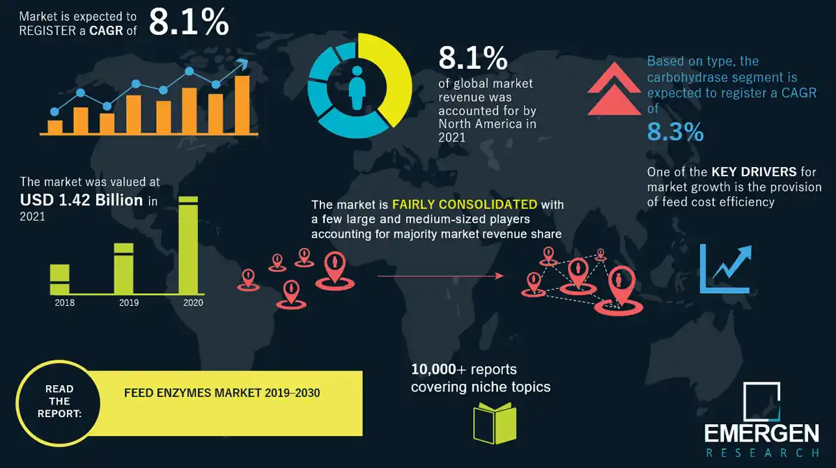 بما أن العديد من الشركات تقوم بتحليل البيانات عن هذا السوق فهناك شركة أبحاث تشير إلى بيانات عن سوق الإنزيمات و هي شركة Stratview Research. و وفقًا لتقرير الشركة ، بلغ حجم سوق إنزيمات الأعلاف العالمية إلى 1.56 مليار دولار أمريكي في عام 2022. وتتوقع الشركة أن ينمو السوق بمعدل نمو سنوي قدره 7.95٪ بين عامي 2023 و2028 ويصل حجمه إلى 2.47 مليار دولار أمريكي في عام 2028.